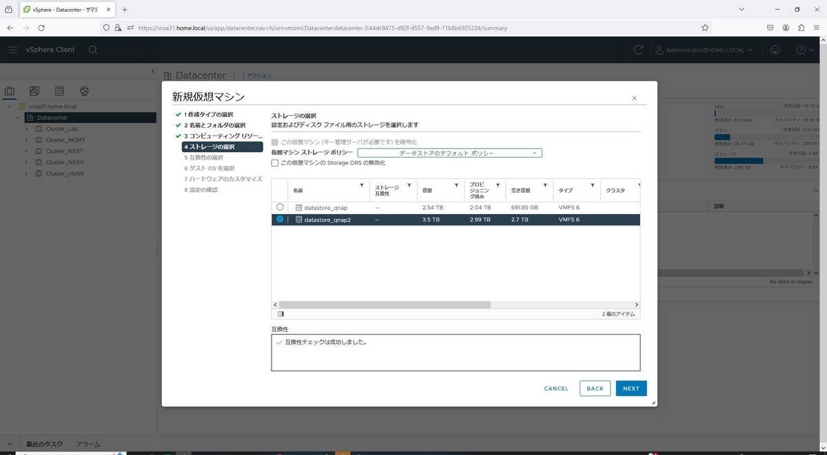 導入するストレージ「datastore_qnap2」を選んで、「NEXT」を選択します。