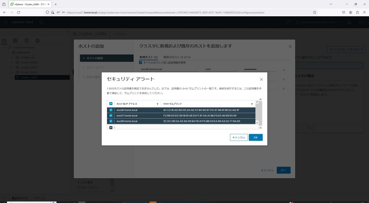 新規ホストから作成したESXiホスト3台のFQDN、ユーザー名、パスワードを入力し、「すべてのホストに同じ認証情報を使用」にチェックを入れ、「次へ」を選択します。