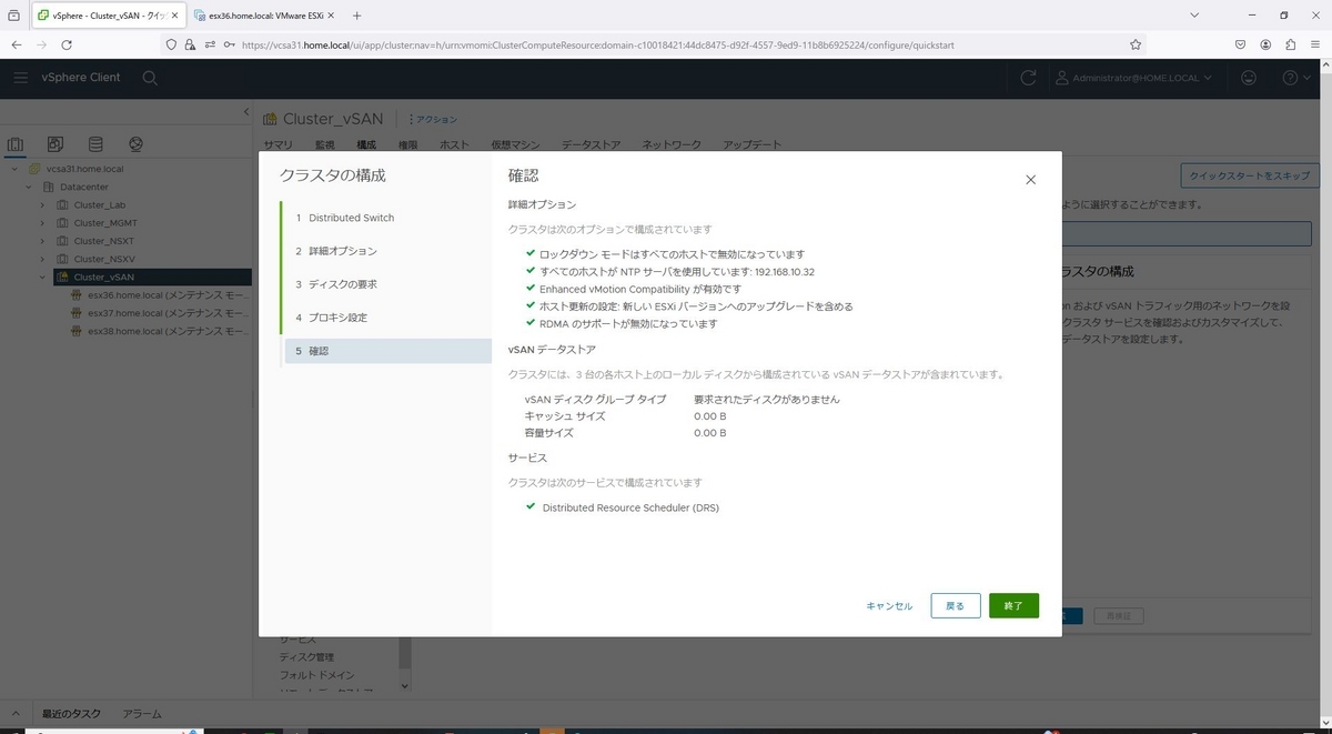 この後、vSphere HAはエラーが発生したので、クラスタ作成後に無効にしています。